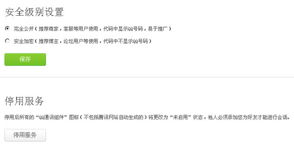 同時建議客戶安全級別設置中選擇“完全公開”(推薦商家,客服等用戶使用,代碼中顯示QQ號碼,易于推廣),這樣任何人不需要加好友就可以直接打開qq進行對話或留言,省去驗證或不在線無法交流的情況。